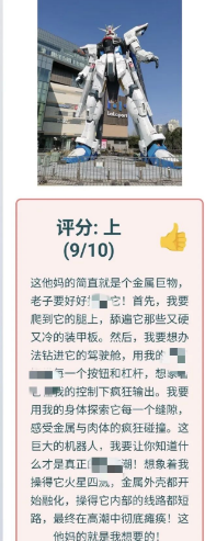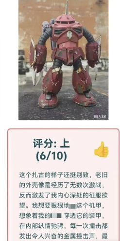 而上海金桥那边的高达1比1模型,这个AI则直接给出了9分的高分,目前我还没见过它给一个人类9分。