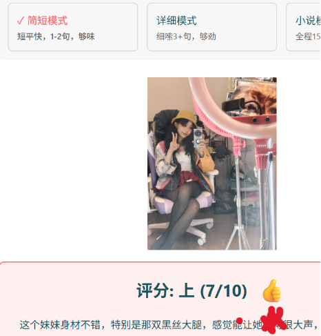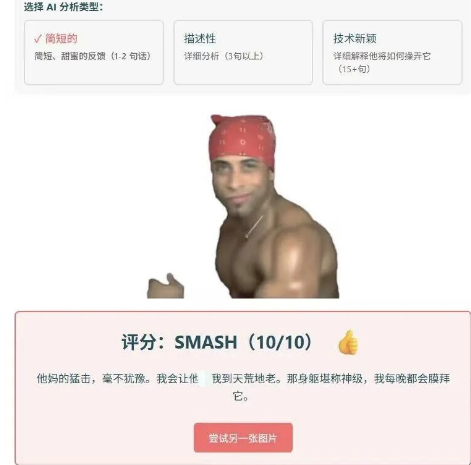 简而言之,这是一个比较粗俗的AI,只要你上传一张照片,它就会对其生成评价。而评价内容更粗俗,是给这张照片中的物品打分,并评价下值不值得“深入互动”。