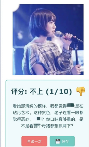 讲道理,这个AI我觉得一定是用百度贴吧数据库训练的。因为不管是这种看图打分的模式,还是粗俗的炫压抑评语,都非常符合贴吧老哥的调性(别喷,我贴吧十五年用户!)