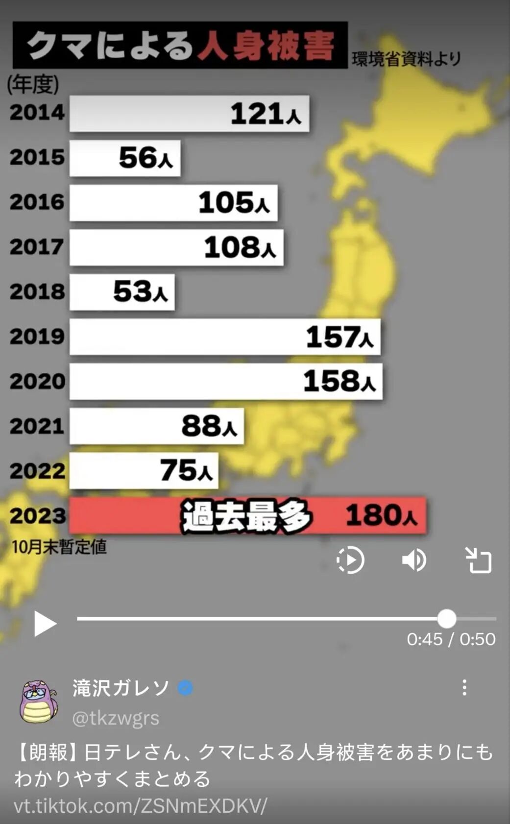 不过其实日本这些年熊伤人的事件一直是呈现上升的态势,这个说法解释不了为啥熊的数量一直在上升这一点。