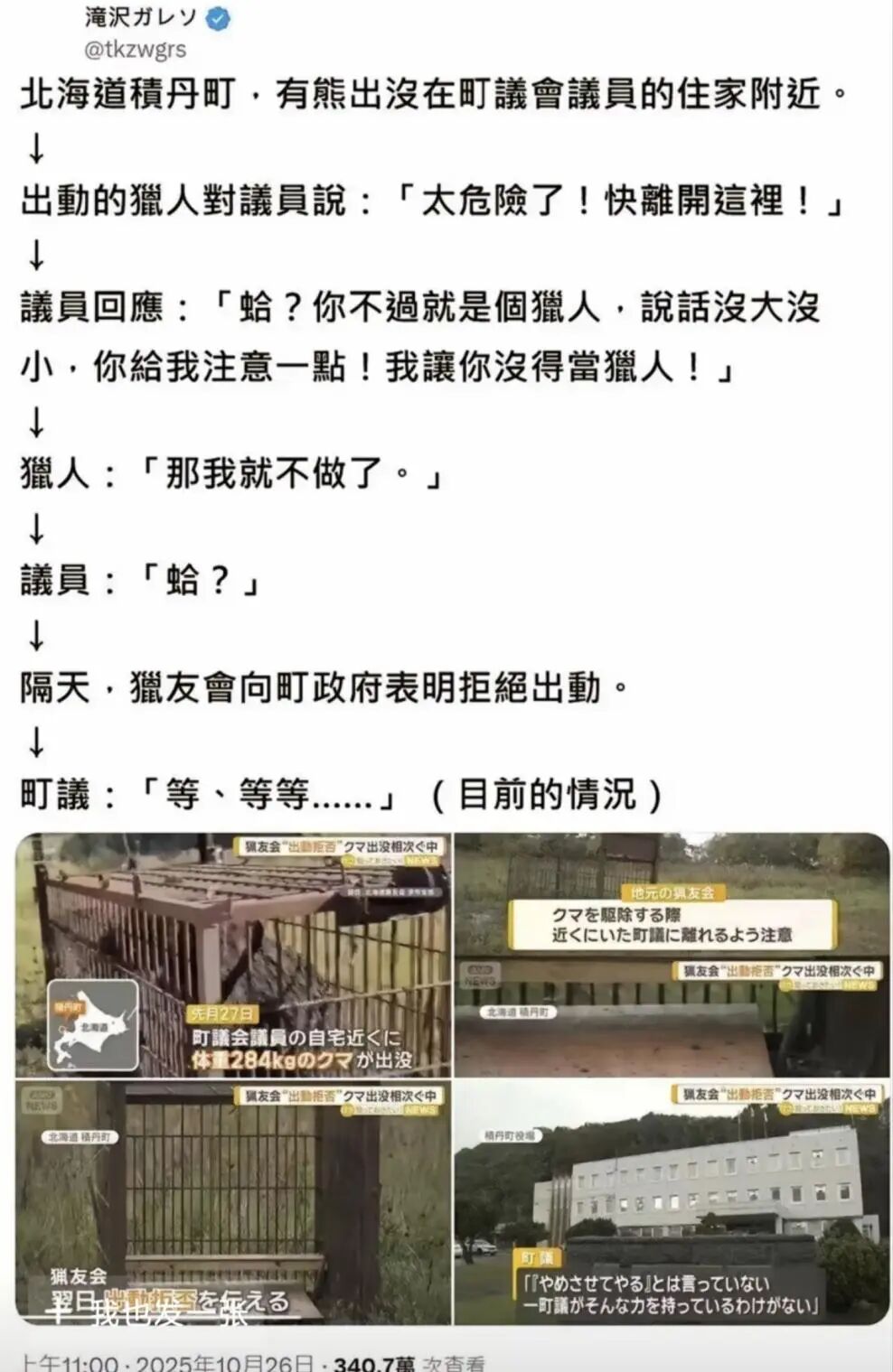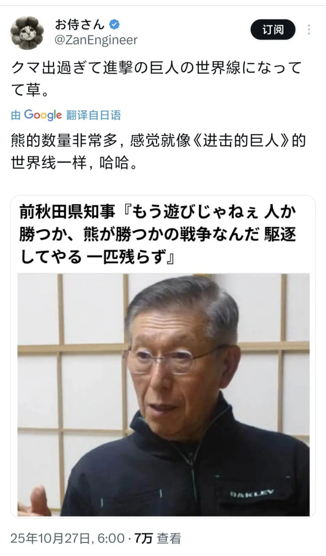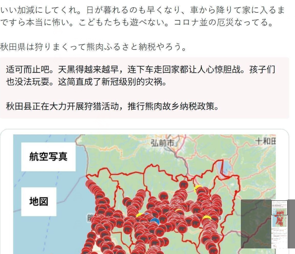 这时候,秋田县的前知事出来适时的加了一把火,表示:“这已经不是普通的熊了!必须出重拳!将熊一只不留的驱逐出去!”——真是进击的巨人是吧?