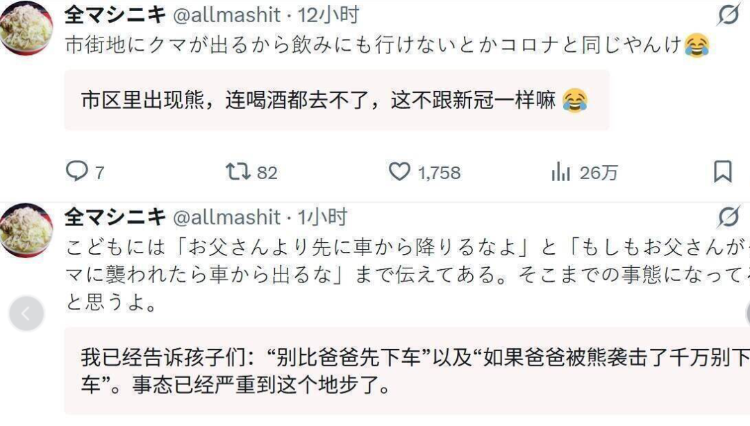 据说黑熊现在已经逐步出现在秋田县的市区(日本县比市大)了,市民甚至不敢随便出门喝酒,因为这玩意一巴掌就能拍碎车玻璃,这就导致许多秋田市民已经不敢出门了。