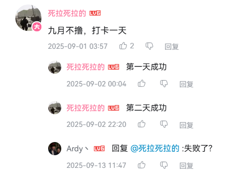 其实这种运动国内也有,就比如此前暴走大事件倡议的“9月不鹿”,没记错当时还掀起了一阵不小的热潮,许多小伙伴们纷纷响应,大概就是相关帖子或者视频下面开一层自己的楼,然后记录坚持了几天。但老猫并没有参与,因为我本来就不怎么鹿!