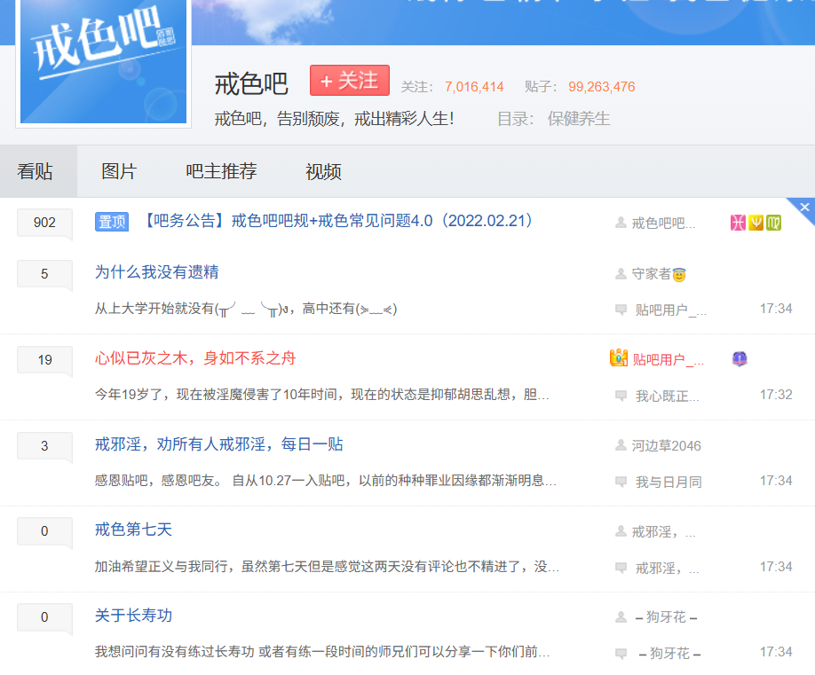 其实在更早之前,国内贴吧也有相关的倡议,这个吧大家应该也多多少少听说过,那就是“戒色吧”——一开始还挺正常,只是让大家适度而行,但是到了后来就变成有点xie教了,天天宣传鹿管是损失元气,日后不管怎么修养也都补不回来,所以人不能鹿!