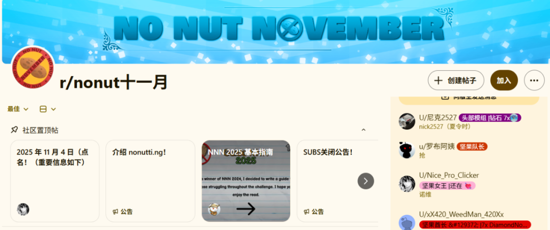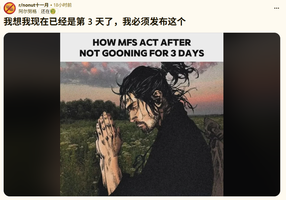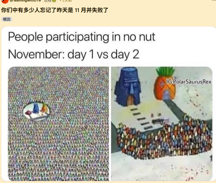 要知道,人在过去那阵“劲”之后人往往会道德占据大脑,再加上大家在那种地方一聚集,只要有一个在社区提起No Nut November运动,那迎接的就将是集体的响应,而事实也确实如此。