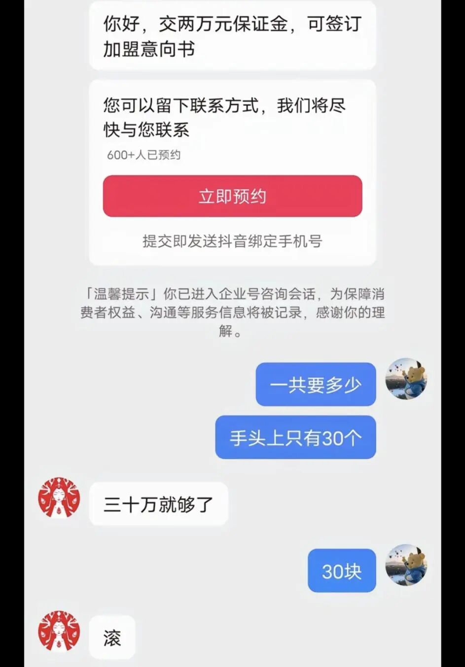 实际上你说这是创业吗?实际上老猫觉得这更像是“被诈骗”,而且还是愿者上钩。讲道理,屏幕前的你看到这种XX月回本,1天赚X万的宣传会上当吗?我觉得很难,因为大家都上过班,知道赚钱多难。而勇哥这里来咨询的大多数都是【刚出校门创业的学生】和【没怎么工作过的宝妈】
