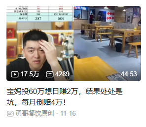 除了上面这位,还有一位宝妈60万投资开了一家酸汤火锅店。加盟的时候,品牌那边的招商经理说:“这店干好了一个天可以赚2万!干个1个月就能回本然后躺着赚钱就行了!”