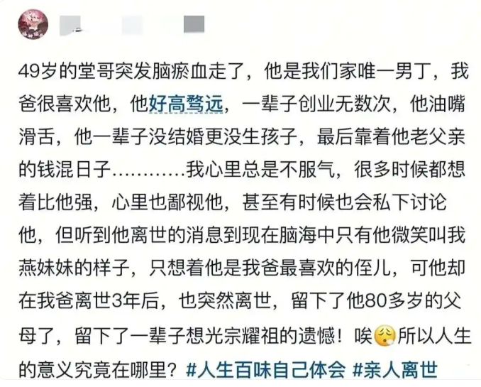 不知道各位身边有没有创业的亲戚兄弟之类的啊?前段时间老猫刷到一个帖子,是一个博主抱怨,自己家有个堂哥刚刚去世,他一辈子好高骛远,不断地创业折腾,结果最后什么也没成功。