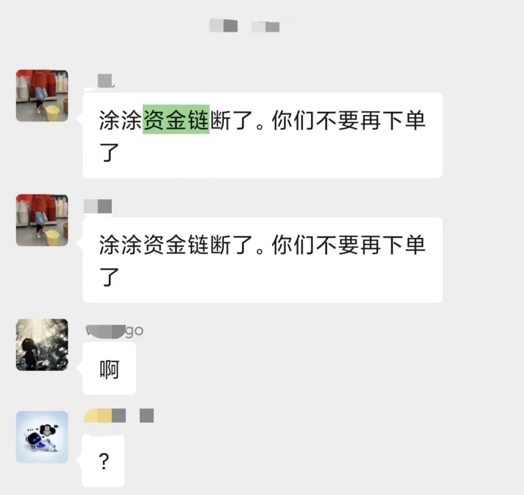 出于信任,大家也并没有多说什么。但是到了11月30日晚上,事情出现了180°的转折。这里要说一下:涂某的主要销售渠道,是一个WX群聊。也正是在这个群聊里,30日晚上有位群友出来说:涂某的资金链断了,发不了货了,大家不要再买东西了。