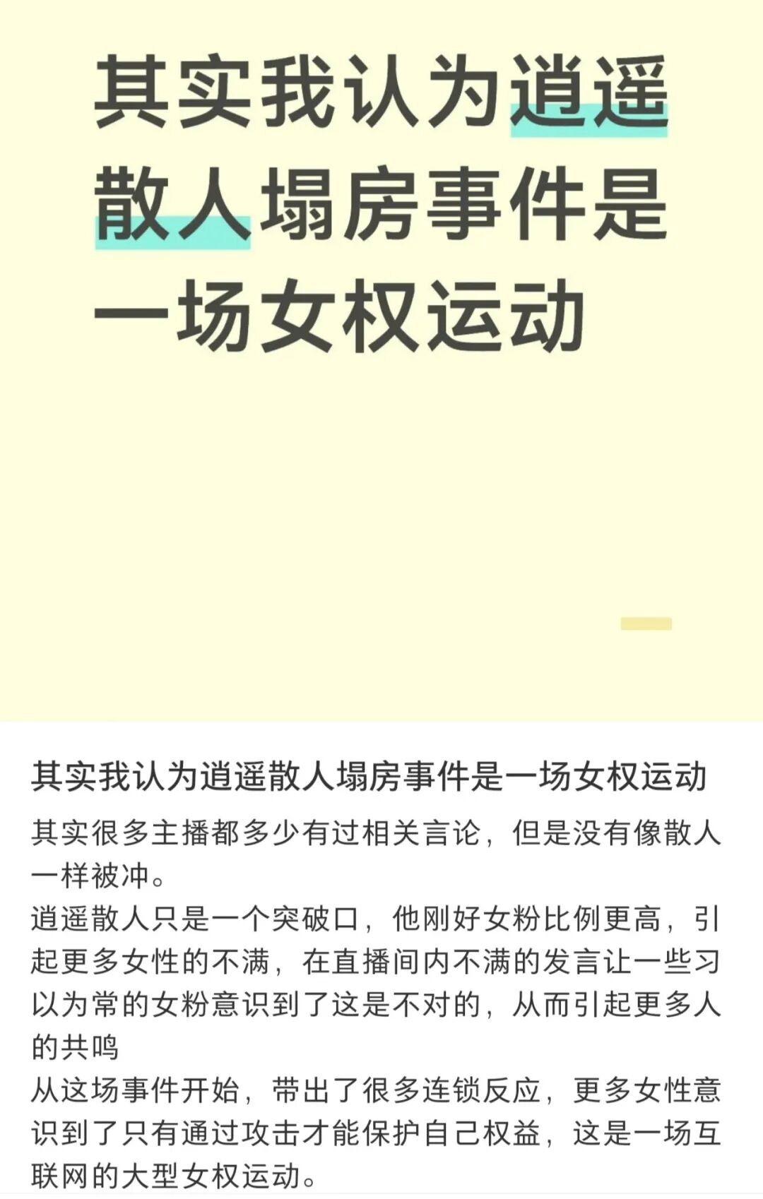 打个比方,你只是一名游戏玩家,不太在乎什么男女之类的,你关注逍遥散人是为了什么呢?看他打游戏评测游戏呗,结果去年最火的游戏你因为怕争议不播,还有一个游戏也怕争议给删了,那要是我早就不关注了,至少也懒得出来给他说话。