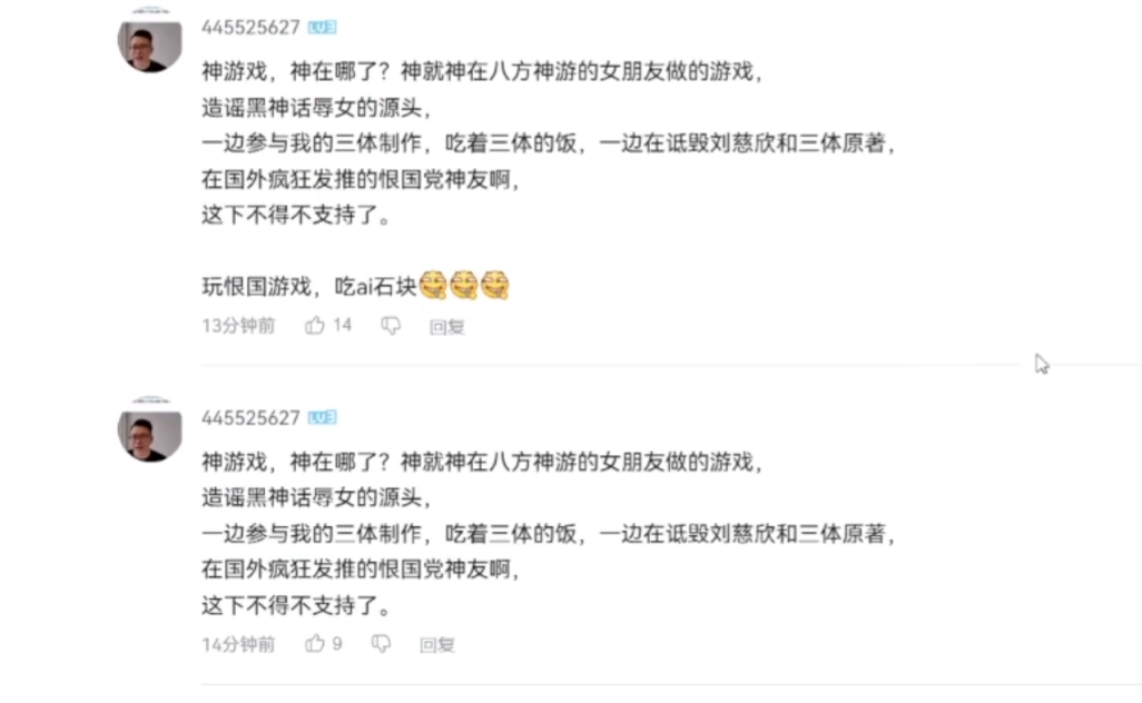 随后男粉们就发现此前他玩过一款名为《一千零一夜》的Dome并且发布了视频切片。但是这个游戏的主创“八方神游”的女友曾经在外网公开辱骂黑神话。于是就要求他删除这个视频,别双标嘛,最后他也照做了。