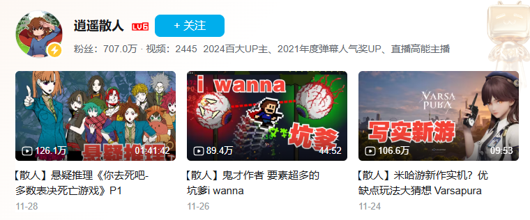 这里咱们得先简单介绍下“逍遥散人”这个UP,他是bilibili游戏区UP主,2024年拿了百大,目前700万粉。