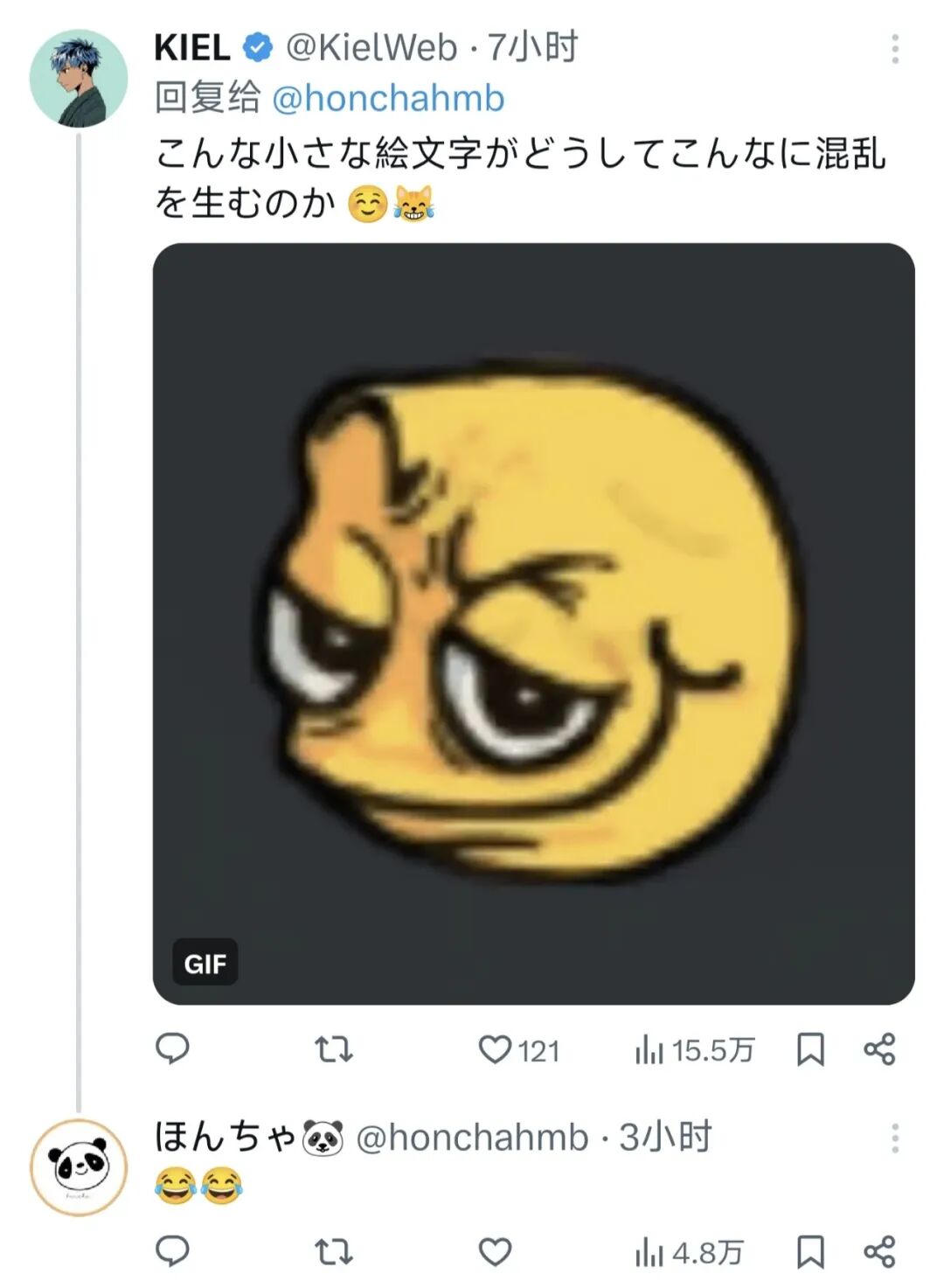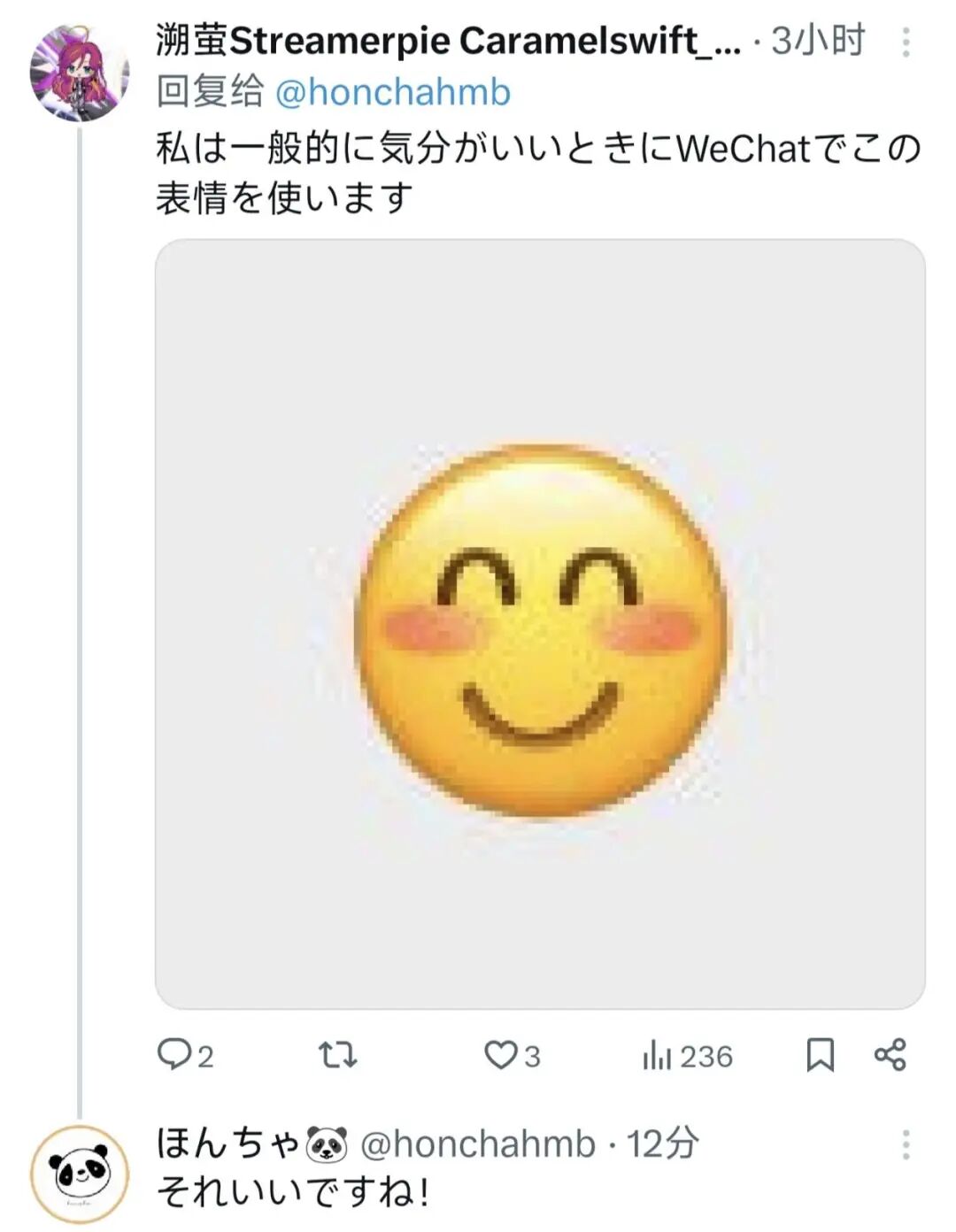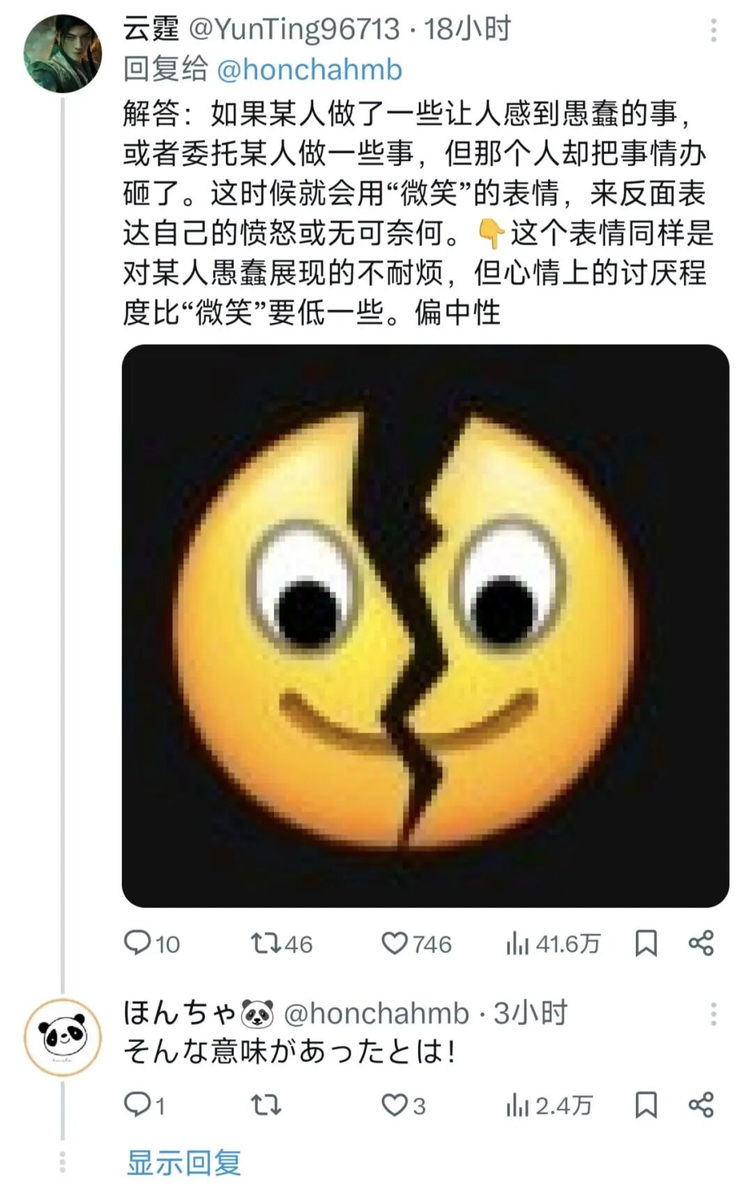 然后还有中国的网友给这位日本推主做了延伸科普,告诉他如果有人给你发裂开了的微笑,看起来更严重,但其实“无奈”的意思更多一点,心情的讨厌程度没有“微笑”那么高。