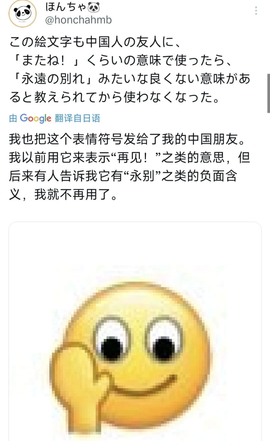 现在这个日本推主,已经开始研究别的表情包了,比如“再见”,他表示这个看起来普通的表情包,实际上有“永别”的意思。