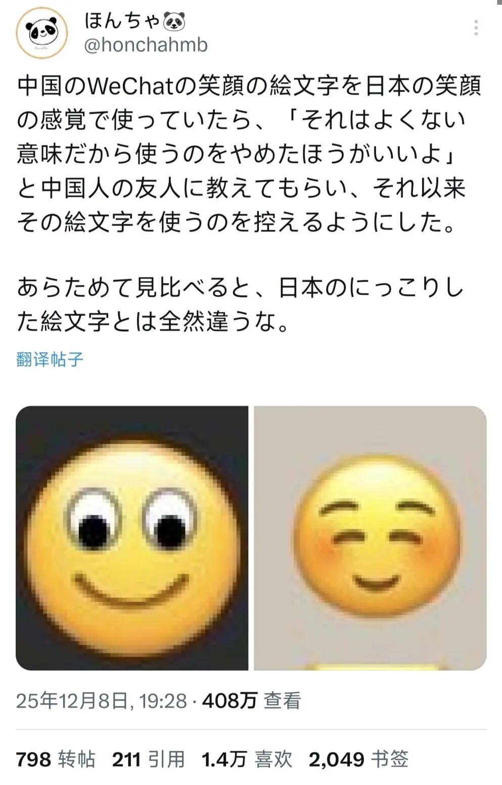 还有中国网友给他科普,如果你想发友善的微笑表情,那么该使用哪一个。