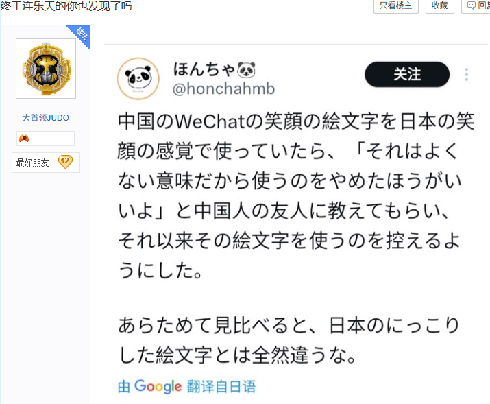翻译:当时我跟中国朋友聊天发了微笑的表情,但是他告诉我个表情有不好的含义。我仔细观察了下日本软件自带的微笑表情,两者好像确实不一样。