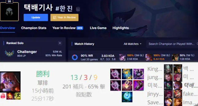 这个名为“快递员#韩进”的玩家,因为2天打了56局,其中52胜4负,综合胜率92%以上,以804胜点暂列韩服第三,所以被人怀疑是AI。
