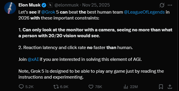 大概意思是:“让我们看看 Grok 5 能否在2026年击败《英雄联盟》最强的人类战队。而且它(指AI)会遵守以下重要限制:
