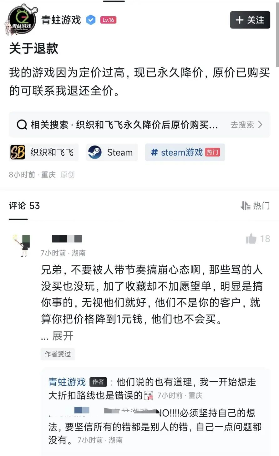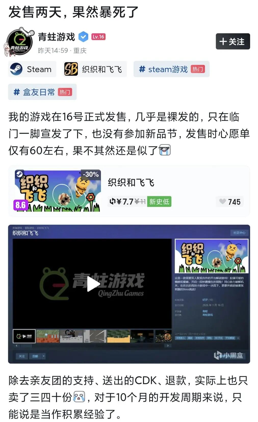 最后,这个游戏还有个致命缺陷,最开始他卖25块......他那个帖子下面有玩家回复:“你这游戏最大的问题是应该上4399,我干嘛不去玩森林冰火人?”