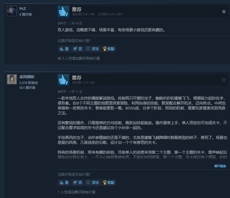 然后就是这个开发者他之前也没有游戏开发经验,只是比较喜欢《双人成行》所以做了这款双虫成行。还参考了《野餐大冒险》《抹布仔》等作品。总之最终成品,非常的糙。又或者说没有亮点,像我们上周写的那个《爱氏物语》虽然玩法和毛病也不少,但美术方面是完全的长板,没得黑。