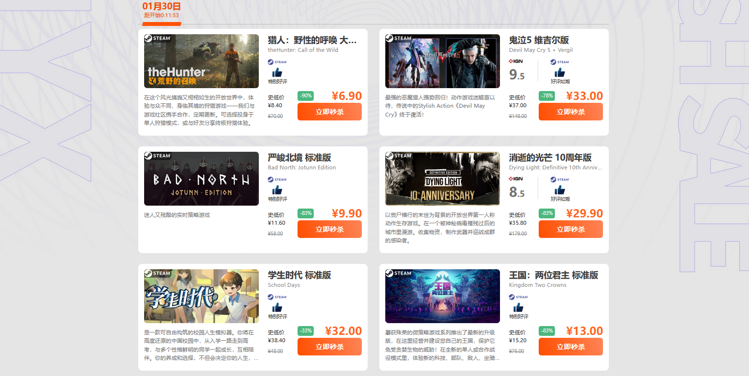 《猎人:野性的呼唤》闪促价:6.9元,史低:7元;