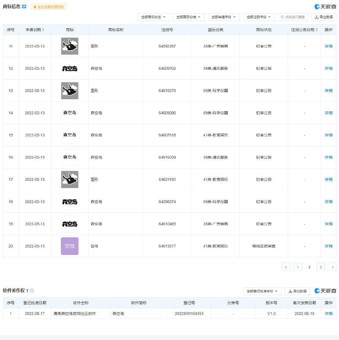 天眼查信息显示,鹰角公司申请的鹰角森空岛著作权登记已于今年8月获批。软件全称「鹰角森空岛游戏社区软件」,“森空岛”商标是五月份就注册了的。