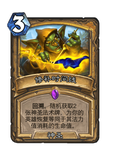 回溯。随机获取2张神圣法术牌。为你的英雄恢复等同于其法力值消耗的生命值。