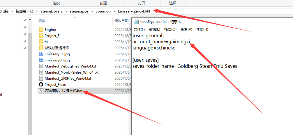 双击打开游戏目录下的“名称修改,快捷方式.bat”,找到“account_name=gaimingzi”,把“gaimingzi”改成自己想要的名字,保存。